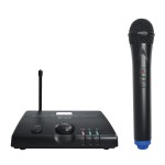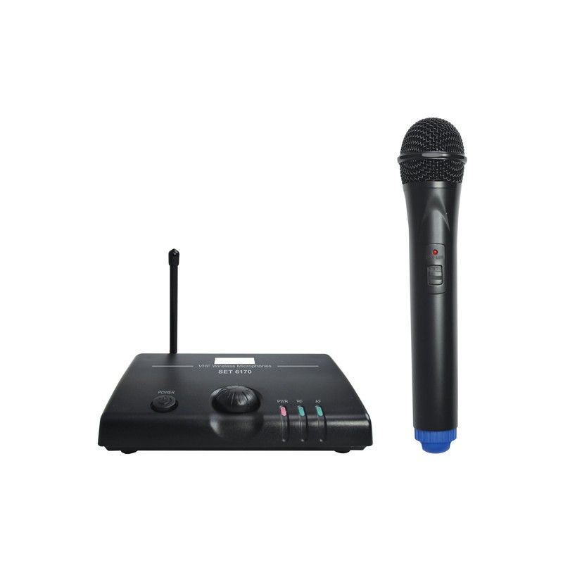 Radio microphone VHF receiver with dual antenna, volume control, and led signal. Maximum range 50 meters. The transmitter, a palm type, it uses 2 batteries 1.5 V with low battery warning.The autonomy of the microphone it is about 6 hours.