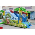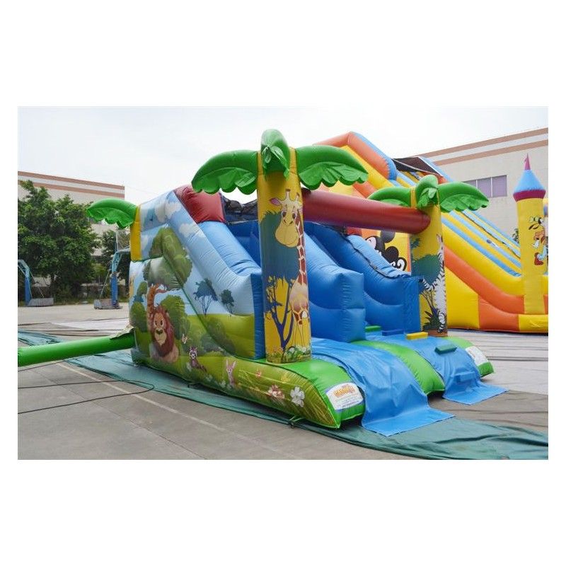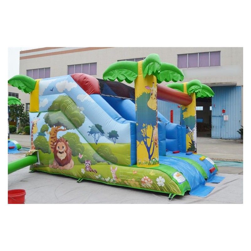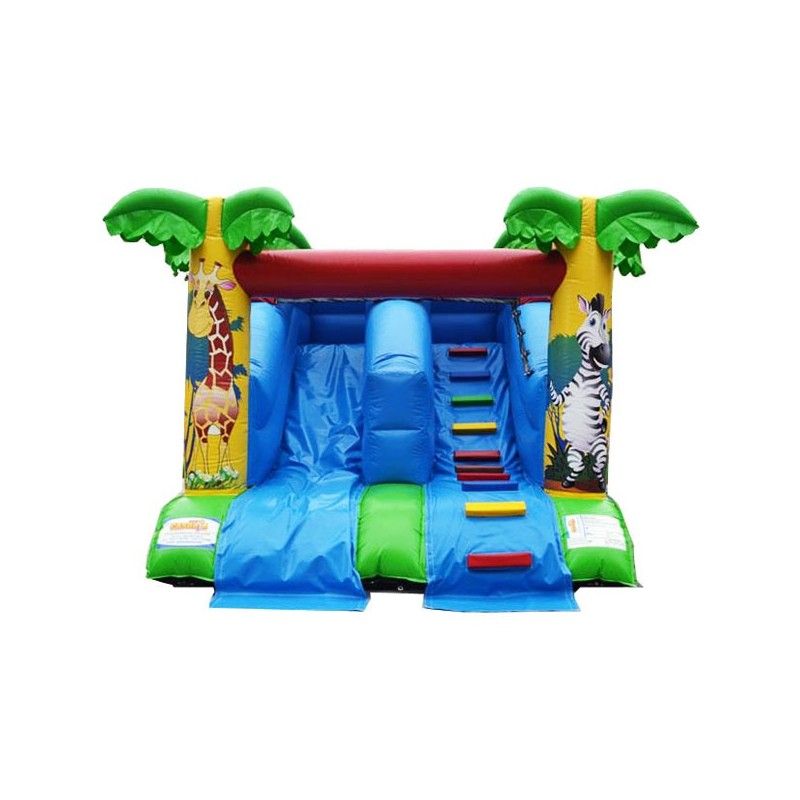 Inflatable slide Safari colorful and lively. Equipped with four palm trees in relief. It is equipped with a slide not too fast, comprehensive network of protection to the top for a game in total safety. Lifts with handrails for easy climbing. Conforming to the UNI EN 14960 Ideal for playgrounds, amusement parks, outdoor games, beaches, bathing establishments, entertainment areas, in general, playgrounds, rest areas, hotels, restaurants and pizzerias, party room.