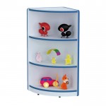 Corner unit in agglomerate wood with rounded corners and shelving for a quick and convenient accommodation. Ideal for school children, nursery, playroom, the playing areas.
