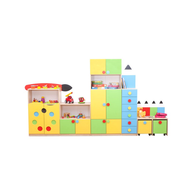 Mobile composizione Matite Colorate, composto da armadi funzionali e pratici, una moltitudine di cassetti e mensole esterne che aiutano la sistemazione di materiali didattici o giocattoli. Bellissima composizione colorata con cassetti a scorrimento di facile apertura e chiusura. Ideale per scuole, ludoteche e nidi.