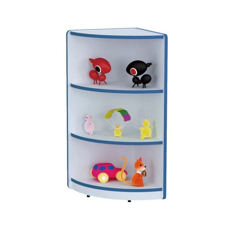 Mobile angolare in agglomerato legno con angoli smussati e ripiani portaoggetti per una rapida ed utile sistemazione. Ideale per scuola infanzia, nido, ludoteca, aree giochi.