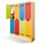 Armadio guardaroba arcobaleno. Il telaio è realizzato in truciolato laminato. Il modulo ha otto sezioni rettangolari, ciascuno dei quali ha un appendino in metallo e una mensola. I colori delle porte sono: rosso, blu, verde e giallo con applicazioni traforate a forma di orsacchiotti e farfalle che consentono la circolazione dell'aria.