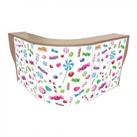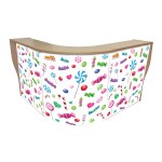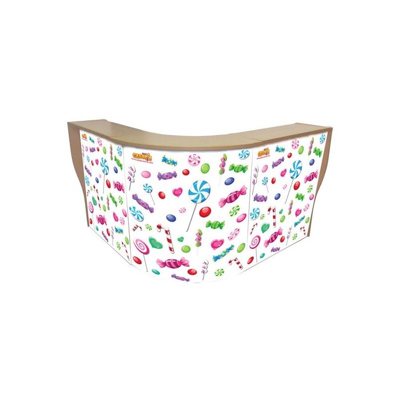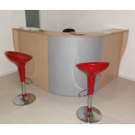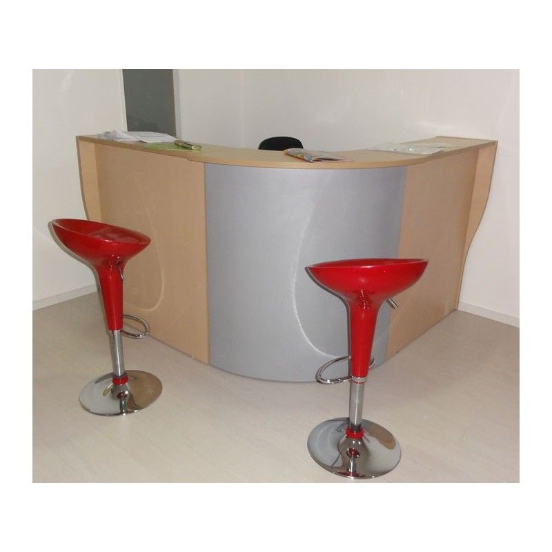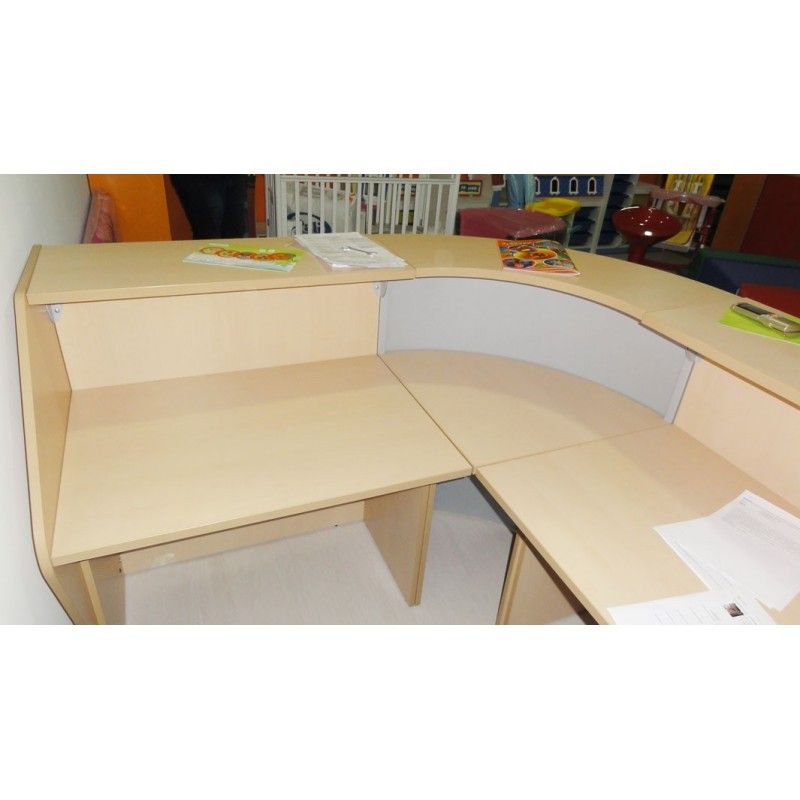 Banco reception con angolo tondo composto da una struttura di supporto in metallo, piano di lavoro e top in legno. Ideale per ludoteca, scuola, asilo, aree per bambini.