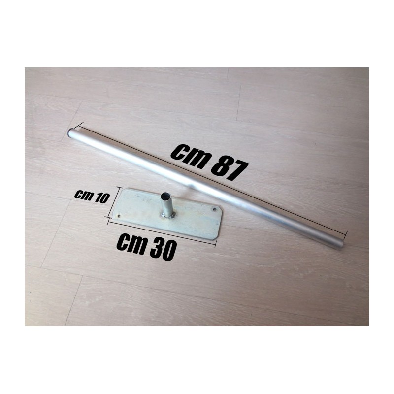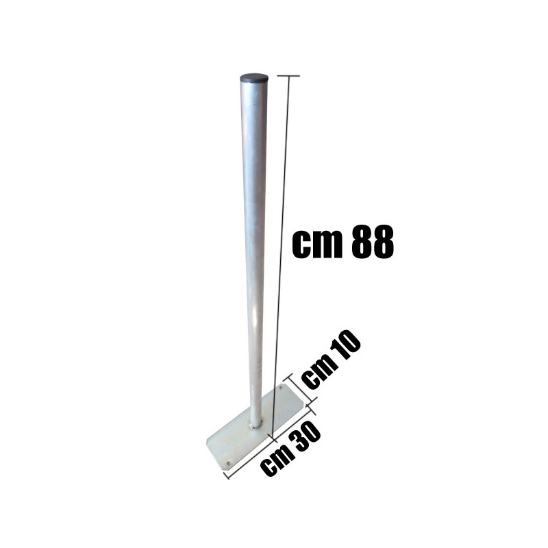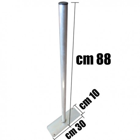 Palo in alluminio di sezione circolare con diametro esterno mm Ø 30 e con altezza mm 870 con tappo copripalo in gomma. Piastra in acciaio zincato di dimensione mm 300 x 100 x 5.