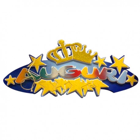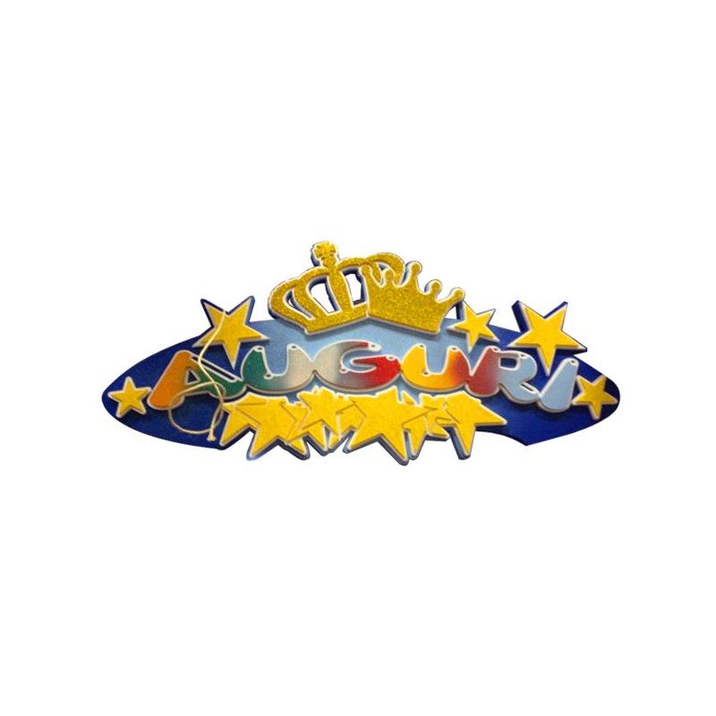 La sagoma decorativa in polistirolo con scritta "AUGURI" è un elemento scenografico di grande impatto visivo. La sua forma ovale, arricchita da stelle dorate e una corona stilizzata, trasmette allegria ed energia festosa in ogni ambiente.