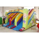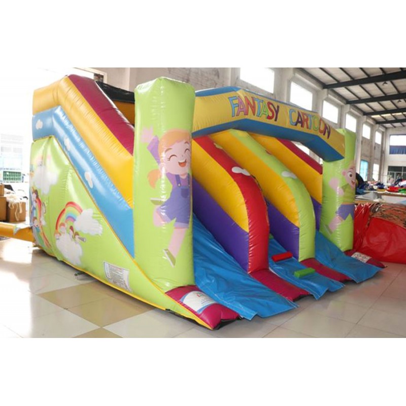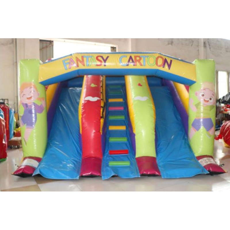 Scivolo gonfiabile Green Cartoon colorato e divertente. Ottimo l'impatto scenico, veloce la scivolata. Il doppio scivolo consente discese multiple ed in contemporanea per un divertimento maggiore. Risalita centrale con doppio passamano per una semplice risalita senza fatica. Conforme alla UNI EN 14960 Ideale per parchi gioco, parchi divertimento, giochi all'aperto, spiagge, stabilimenti balneari, aree di intrattenimento in generale, ludoteche, aree di ristoro, alberghi, ristoranti e pizzerie, sala feste.