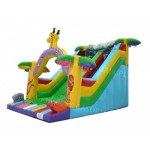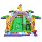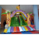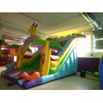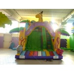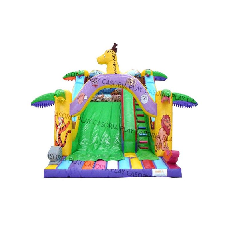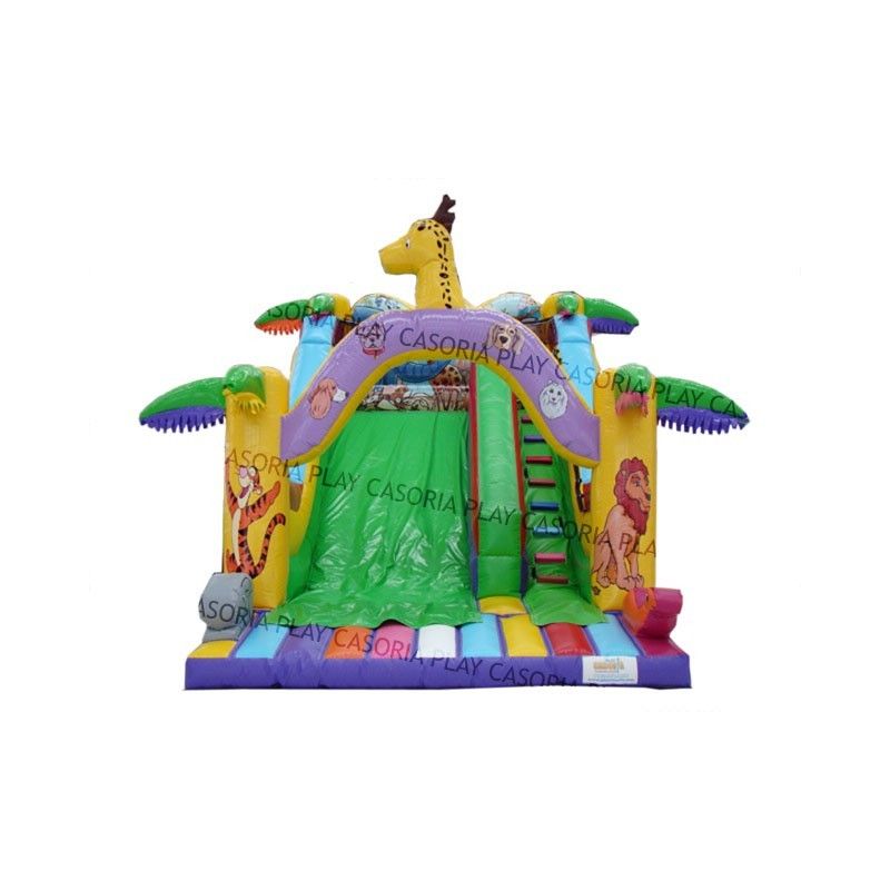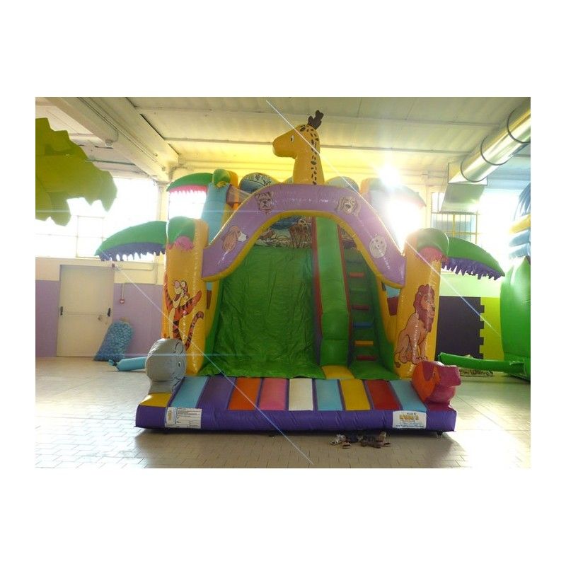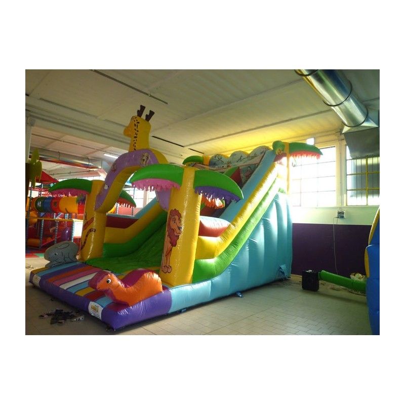 Coloratissimo scivolo gonfiabile La Jungla. Questo bellissimo gonfiabile è dotato di quattro palme in rilievo e figure varie che ritraggono diversi animali. I colori sono vivaci e lo rendono adatto per qualsiasi attività ludica. La rete di protezione nella parte superiore conferisce ulteriore sicurezza. Conforme alla UNI EN 14960 Ideale per parchi gioco, parchi divertimento, giochi all'aperto, spiagge, stabilimenti balneari, aree di intrattenimento in generale, ludoteche, aree di ristoro, alberghi, ristoranti e pizzerie, sala feste.