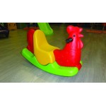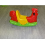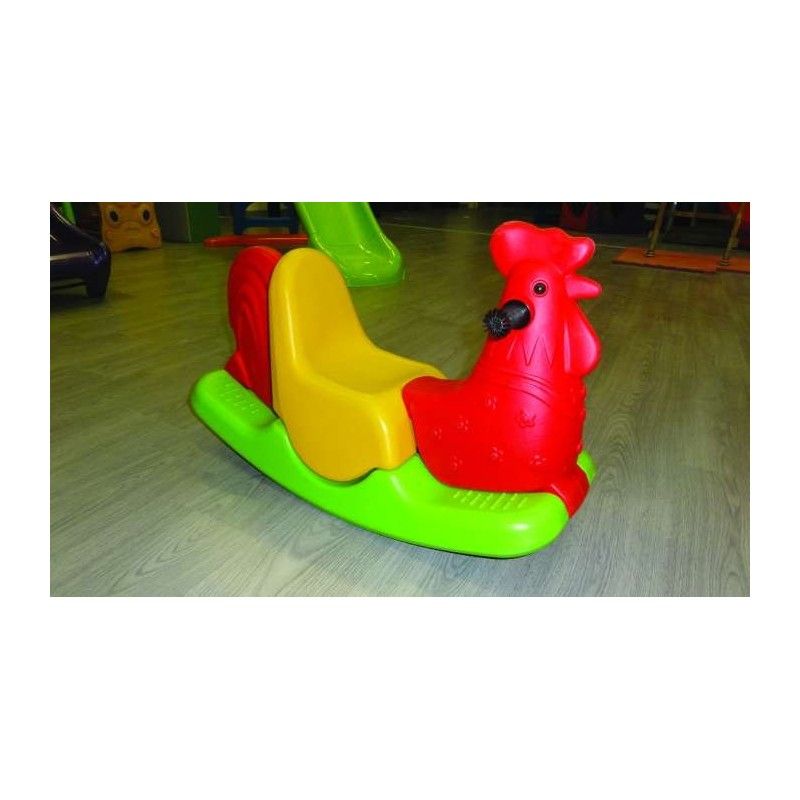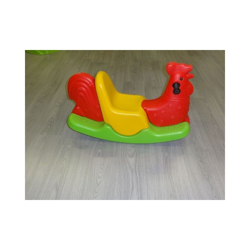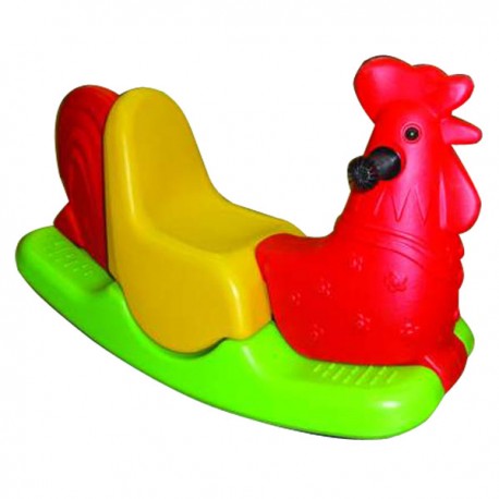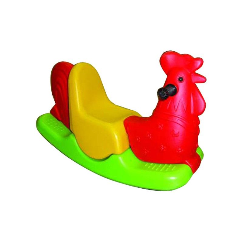 Gioco a dondolo in plastica a forma di gallo, completo di comodo schienale e poggiapiedi per offrire maggiore sicurezza e comfort.