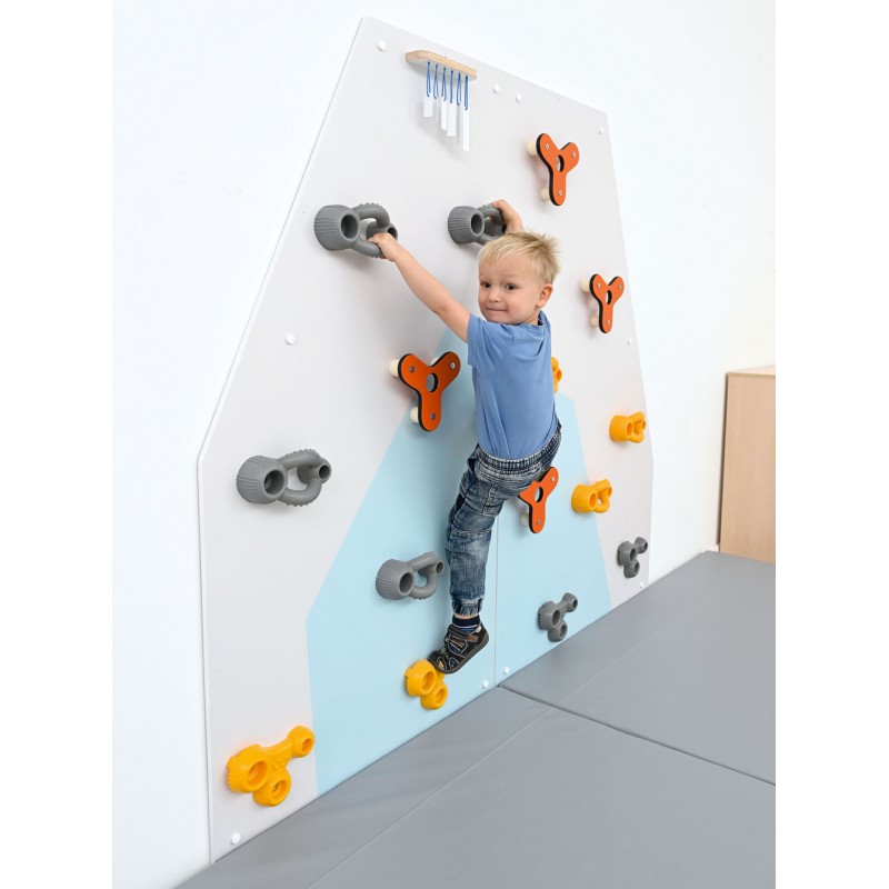 Parete di arrampicata moderna e stimolante, progettata per il gioco sicuro e lo sviluppo motorio dei bambini. La parete include elementi tridimensionali e sensoriali che stimolano il tatto e la coordinazione, rendendo l'esperienza ludica ancora più coinvolgente. Ideale per scuole, ludoteche e aree gioco interne.