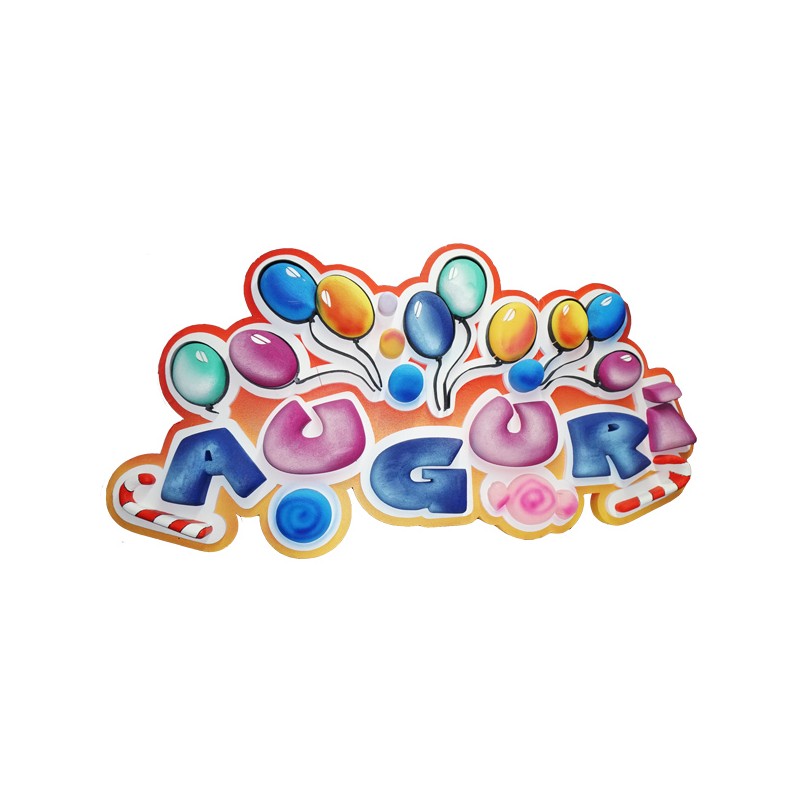 Sagoma decorativa in polistirolo con scritta “TANTI AUGURI” e allegri palloncini stilizzati integrati nel design. Perfetta per allestimenti scenografici in occasione di compleanni, eventi per bambini e ricorrenze speciali.