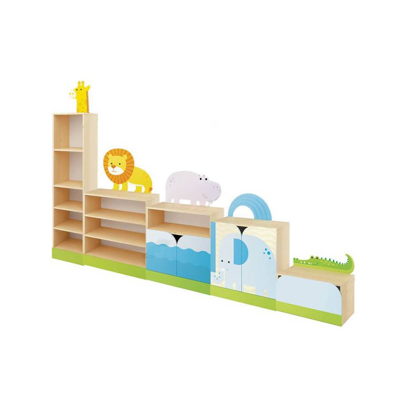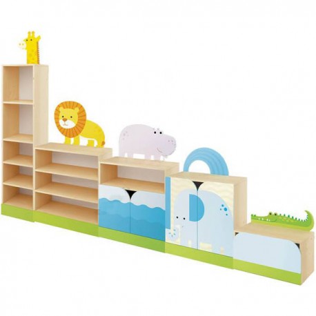 Bellissima composizione tema JUNGLA con sagome animali a decorare i mobili. La composizione dispone numerosi ripiani e porte da aprire per poter riporre oggetti e giocattoli di ogni genere. Ideale per ludoteche, scuole, nidi e molto altro.