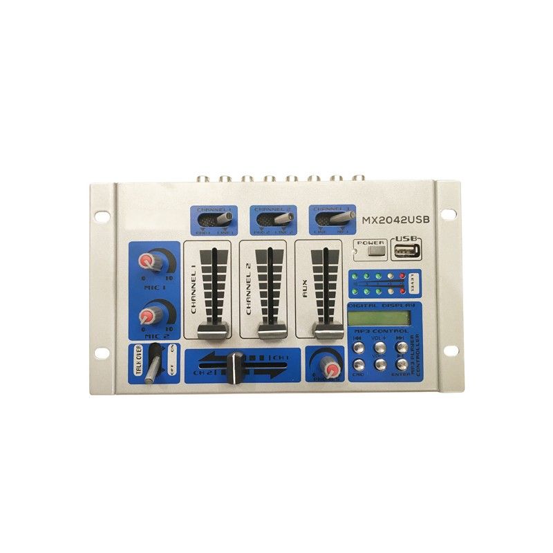 Di terza generazione, questo piccolo mixer, versatile e compatto, rappresenta uno degli articoli più apprezzati. Posside 3 ingressi di linea, 2 phono, 2 ingressi microfonici e un lettore USB in grado di riprodurre i brani Mp3. Il display retroilluminato ad alta definizione, mostra, grazie al circuito ID3, il nome dei brani e degli autori. I volumi dei microfoni sono regolabili separatamente, dispone di funzione talkover manuale. VU meters, ascolto in cuffia e crossfader completano l'apparecchio.