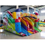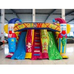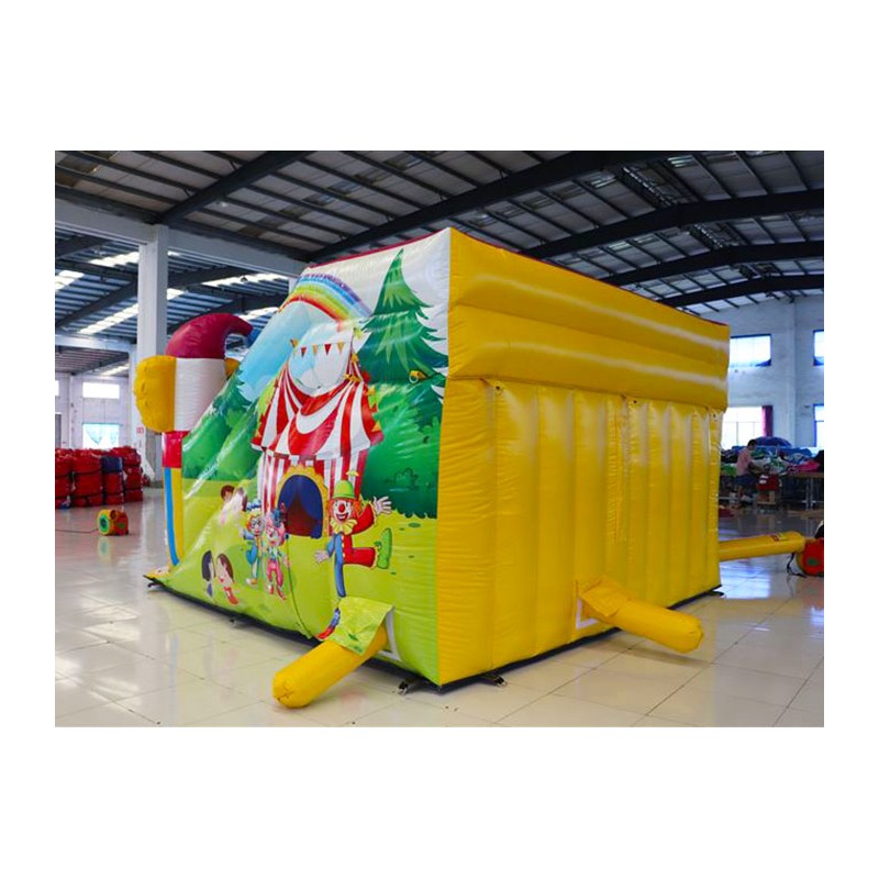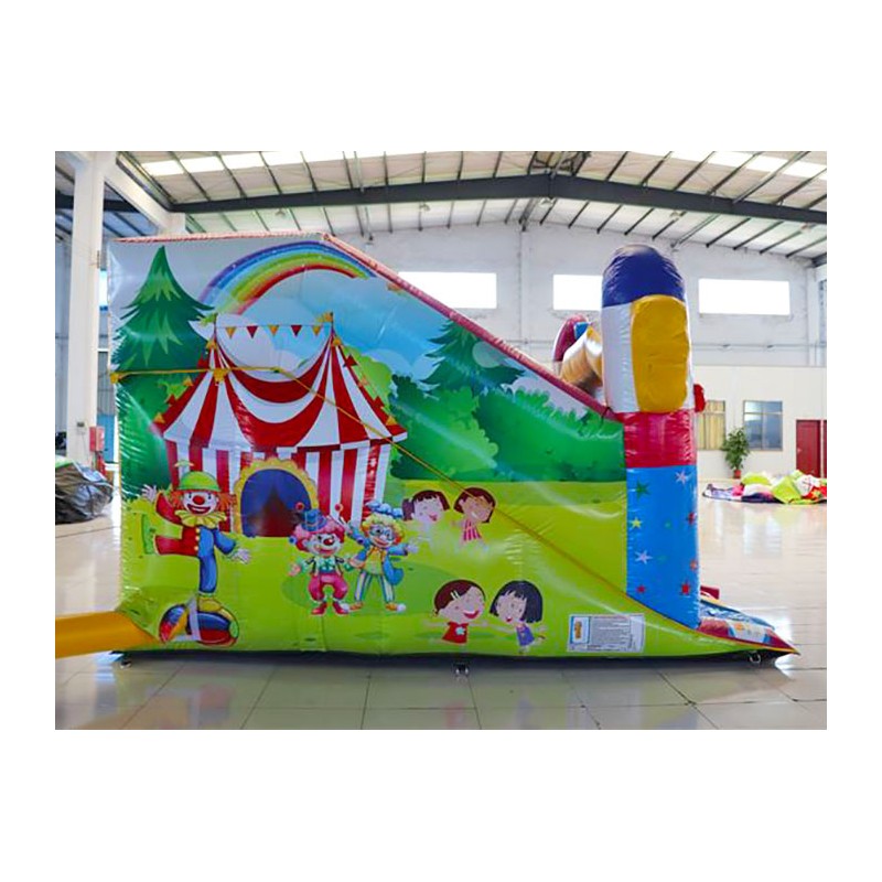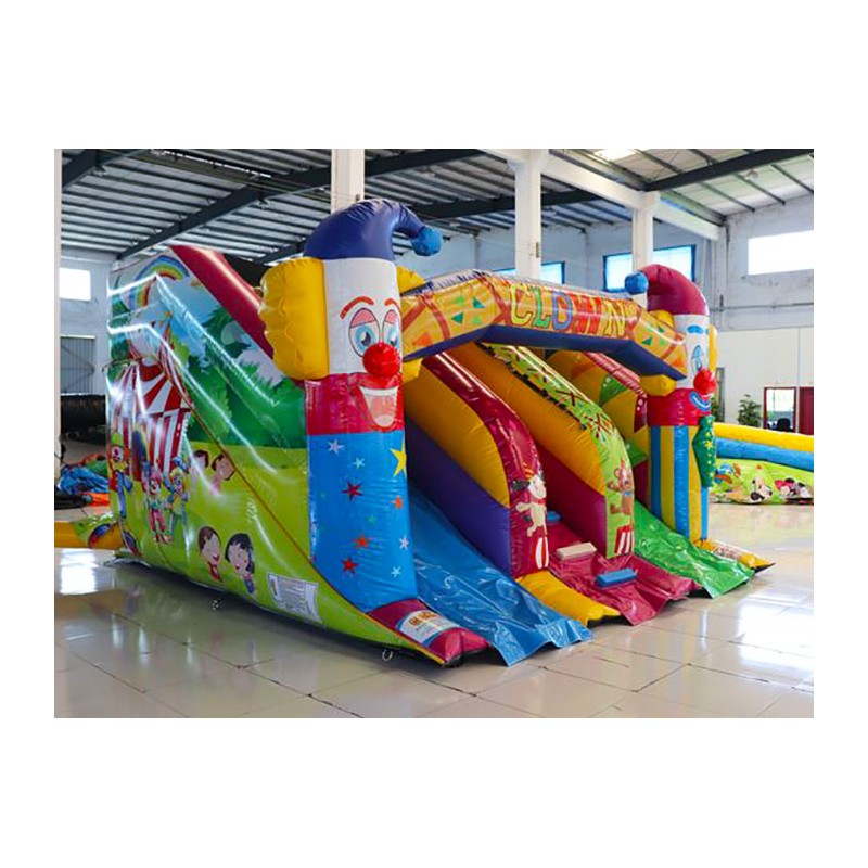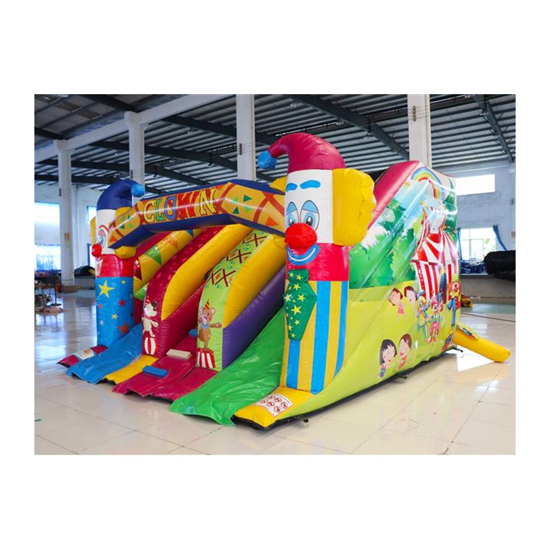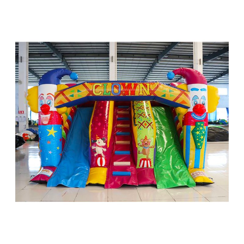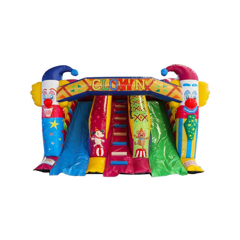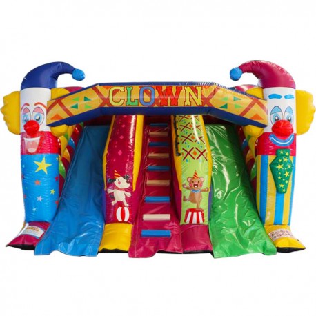 Scivolo gonfiabile Clown colorato e divertente. Ottimo l'impatto scenico, veloce la scivolata. Il doppio scivolo consente discese multiple ed in contemporanea per un divertimento maggiore. Risalita centrale con doppio passamano per una semplice risalita senza fatica. Conforme alla UNI EN 14960 Ideale per parchi gioco, parchi divertimento, giochi all'aperto, spiagge, stabilimenti balneari, aree di intrattenimento in generale, ludoteche, aree di ristoro, alberghi, ristoranti e pizzerie, sala feste.