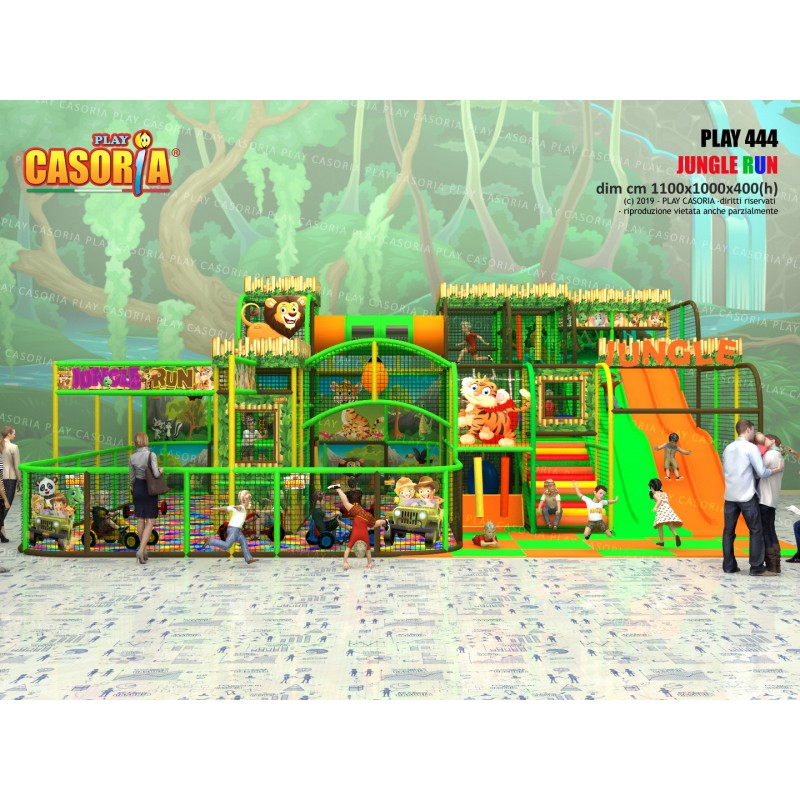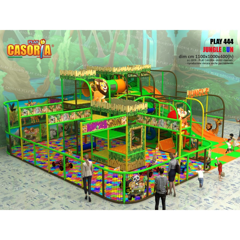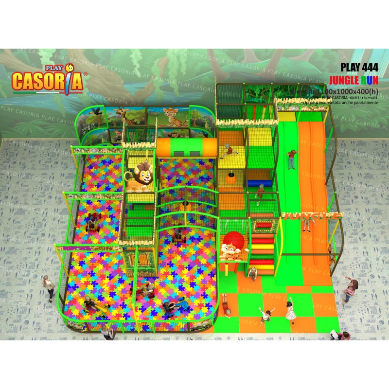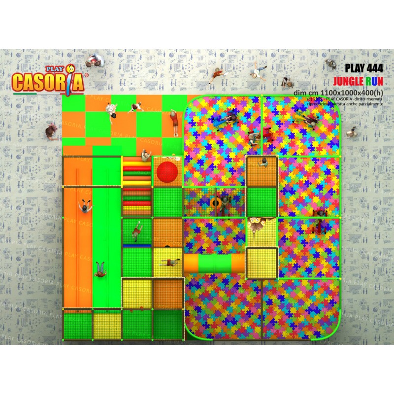 Playground modulare a tre piani con doppio scivolo lungo a lato del playground. E' dotato anche di passaggio a tubo che ne aumenta la complessità e il colpo d'occhio. Playground ideale per ludoteche, parchi gioco, centri commerciali, cinema, bar, ristoranti, pizzerie. Tematizzazione personalizzabile su richiesta.