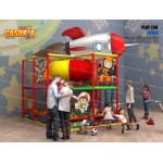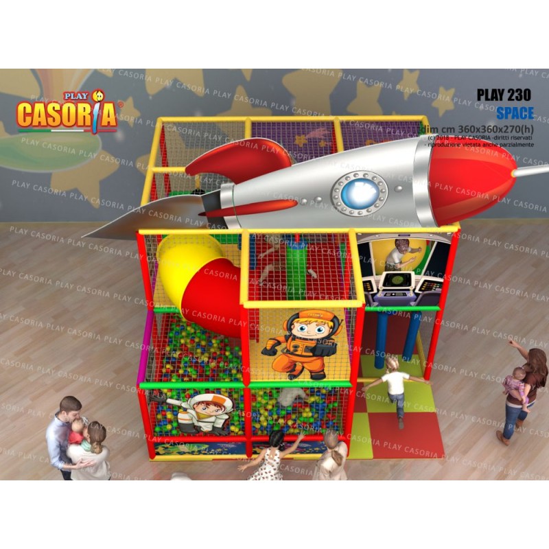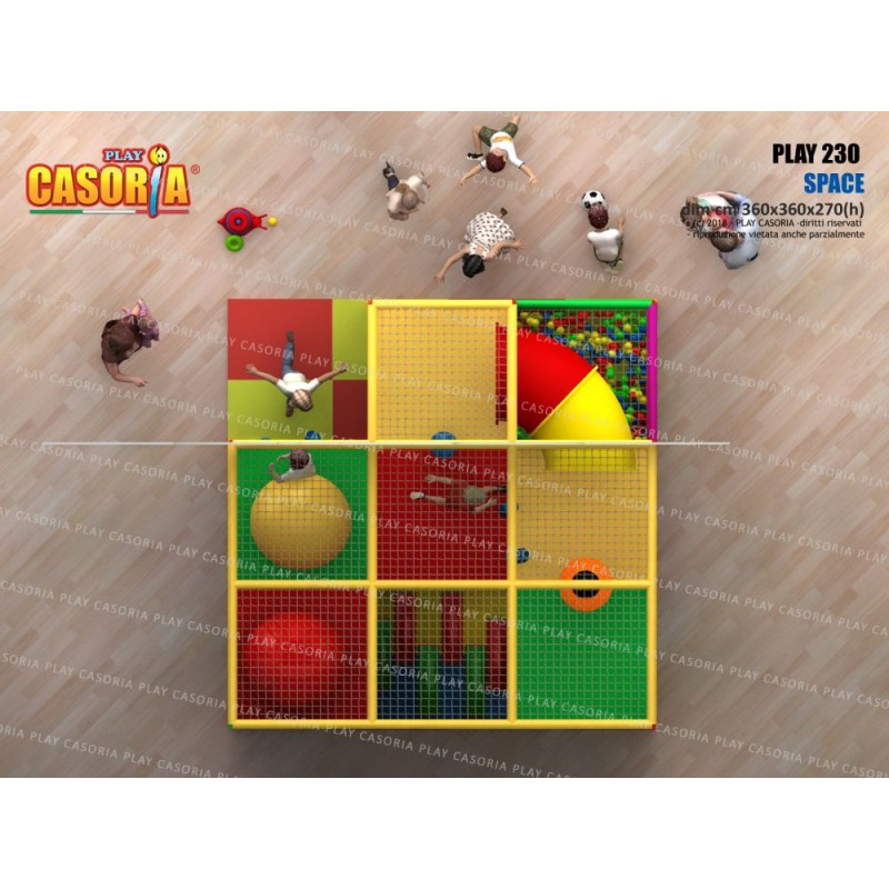 Playground modulare a due piani con piscina delle palline. E' dotato anche di passaggio a tubo che ne aumenta la complessità e il colpo d'occhio. Adatto a chi avendo poco spazio non vuol rinunciare ad un articolo complesso. Playground ideale per ludoteche, parchi gioco, centri commerciali, cinema, bar, ristoranti, pizzerie.