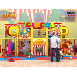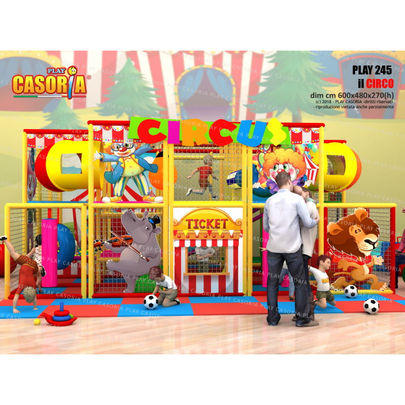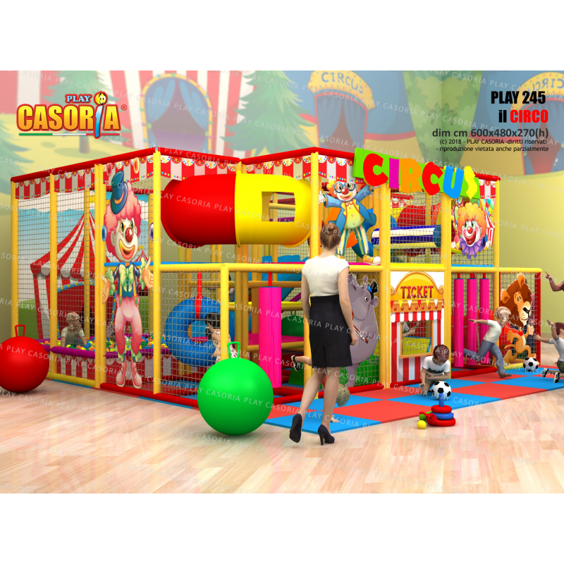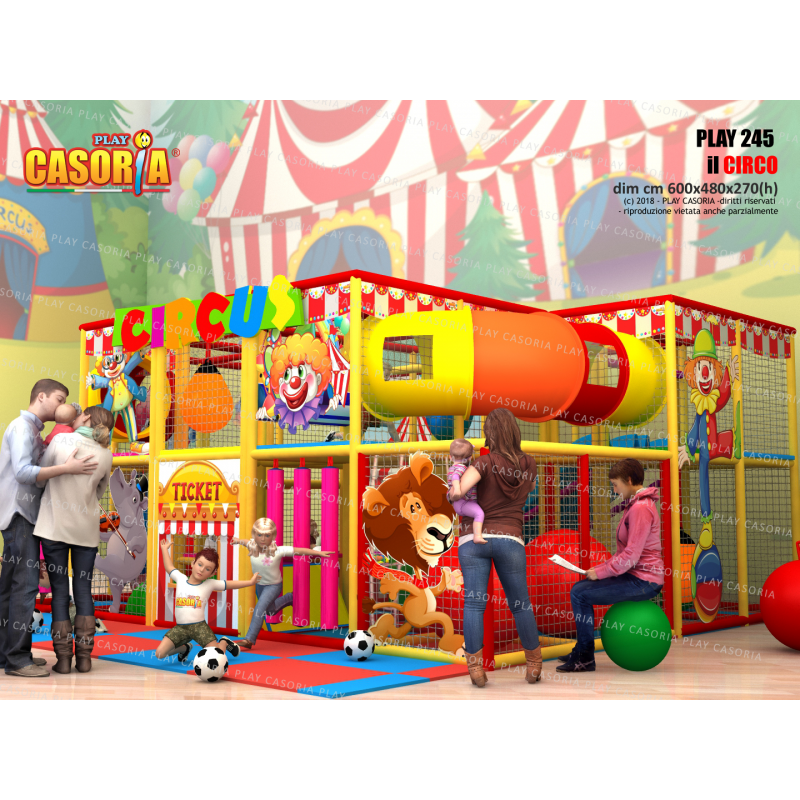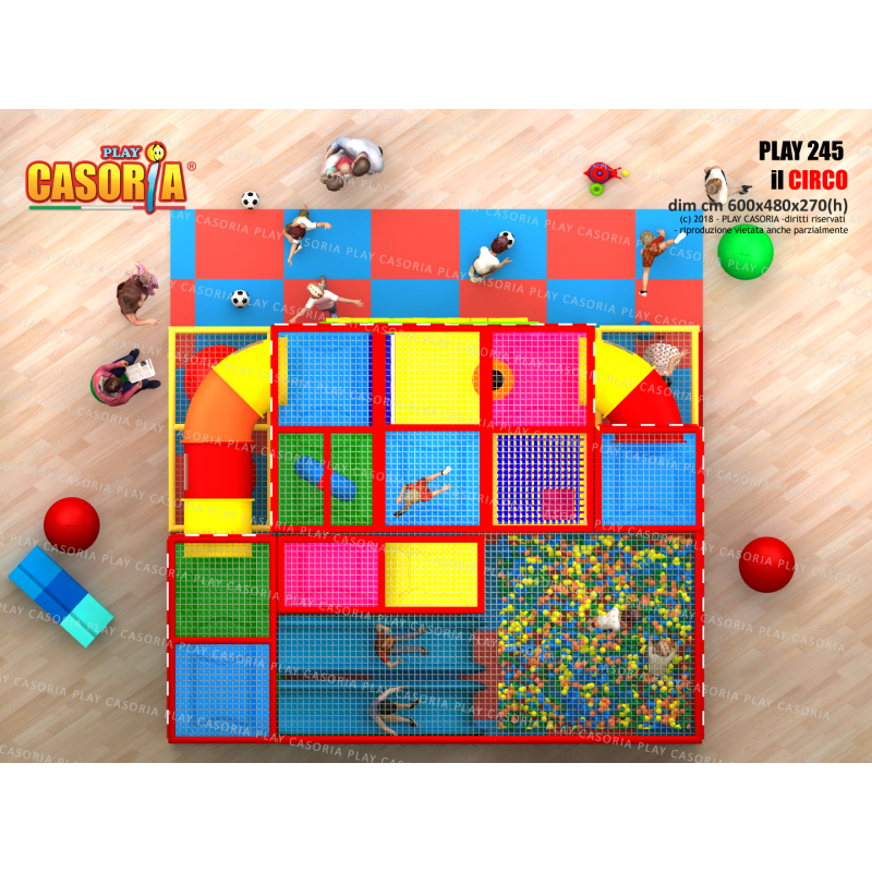 Playground modulare a due piani con piscina delle palline e doppio scivolo. E' dotato di zona palloni giganti. Adatto a chi avendo poco spazio non vuol rinunciare ad un articolo complesso. Playground ideale per ludoteche, parchi gioco, centri commerciali, cinema, bar, ristoranti, pizzerie.