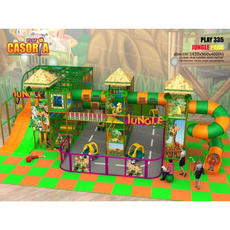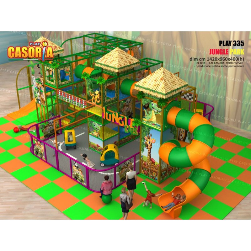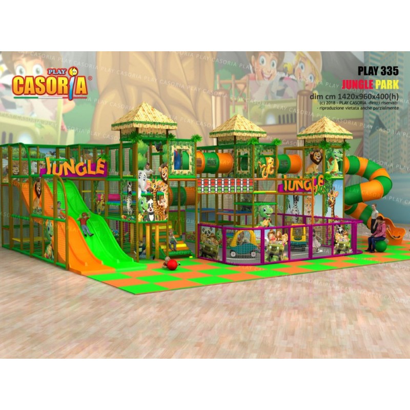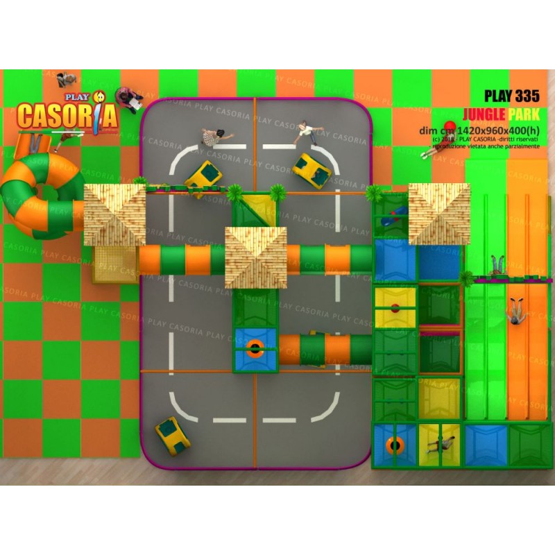 Playground modulare a tre piani con doppio scivolo lungo a lato del playground. E' dotato anche di altr 2 sezioni playground collegate tramite passaggi a tubo che ne aumentano la complessità e il colpo d'occhio. Sull'ultima struttura Playground è installato uno spettacolare scivolo a tubo a chiocciola. Struttura Playground ideale per ludoteche, parchi gioco, centri commerciali, cinema, bar, ristoranti, pizzerie. Tematizzazione personalizzabile su richiesta.