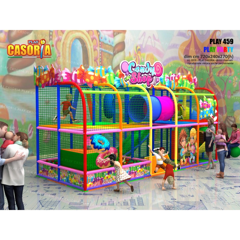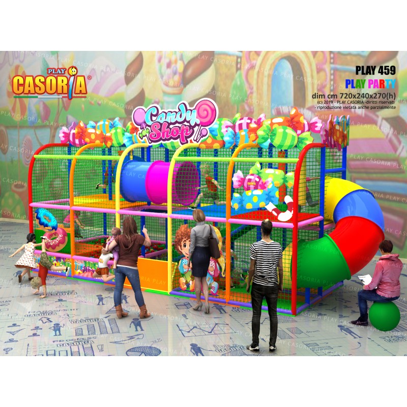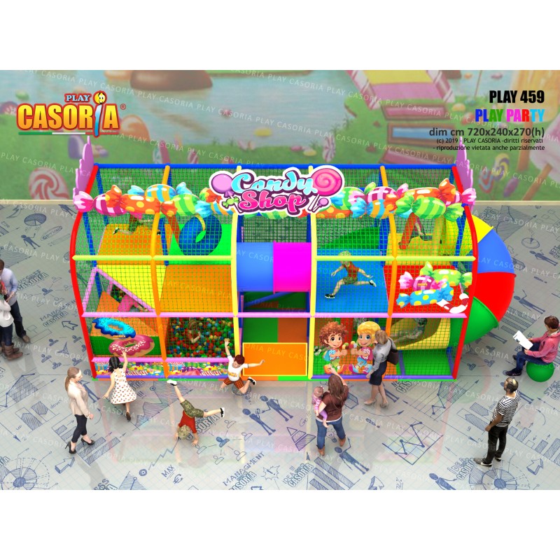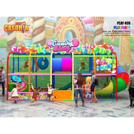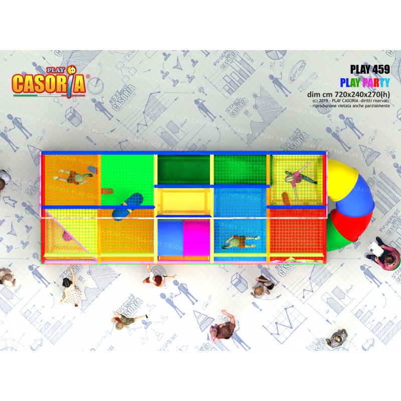 Playground modulare a due piani con il scivolata nella vasca palline. Grazie alla sua forma compatta ed alla presenza di tanti giochi ed accessori particolarmente adatto per chi cerca tanto divertimento in poco spazio. Playground ideale per ludoteche, parchi gioco, centri commerciali, cinema, bar, ristoranti, pizzerie