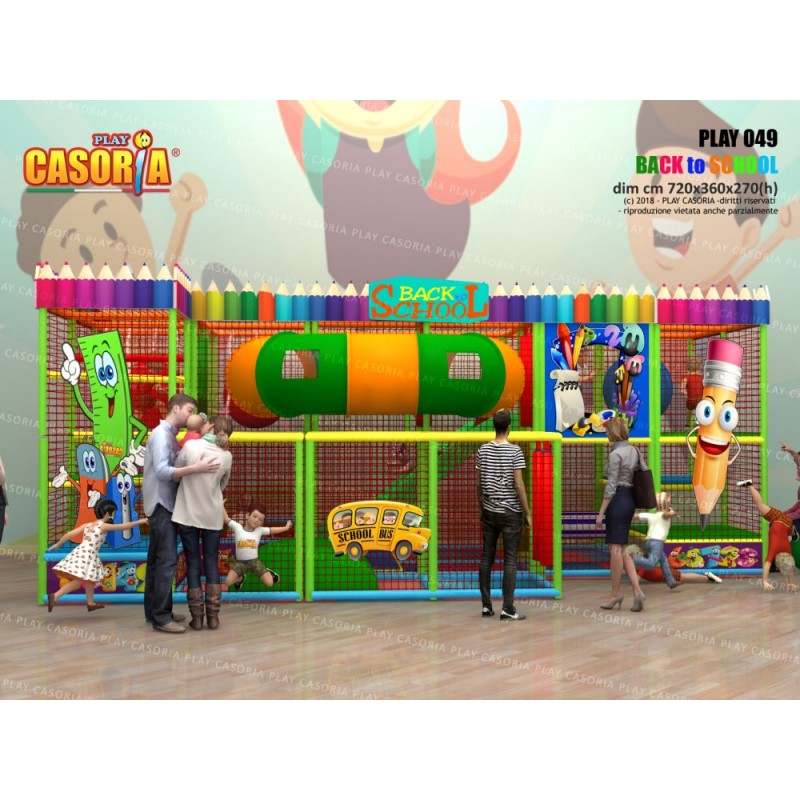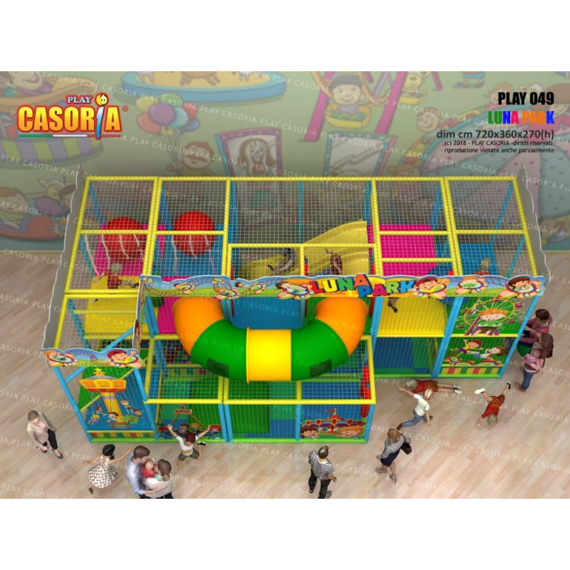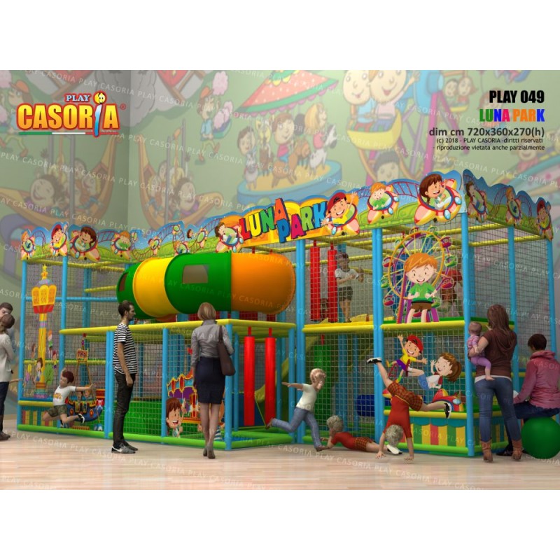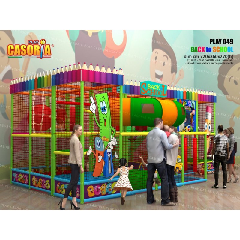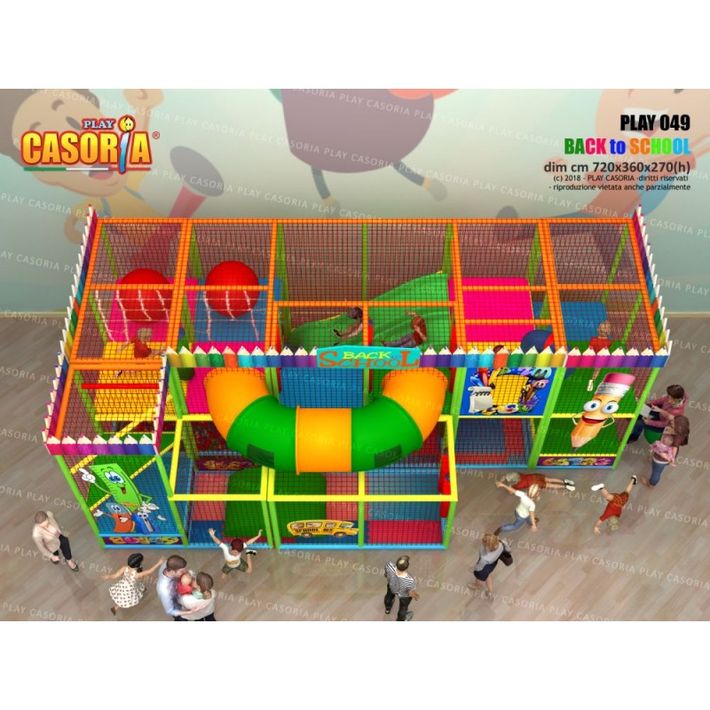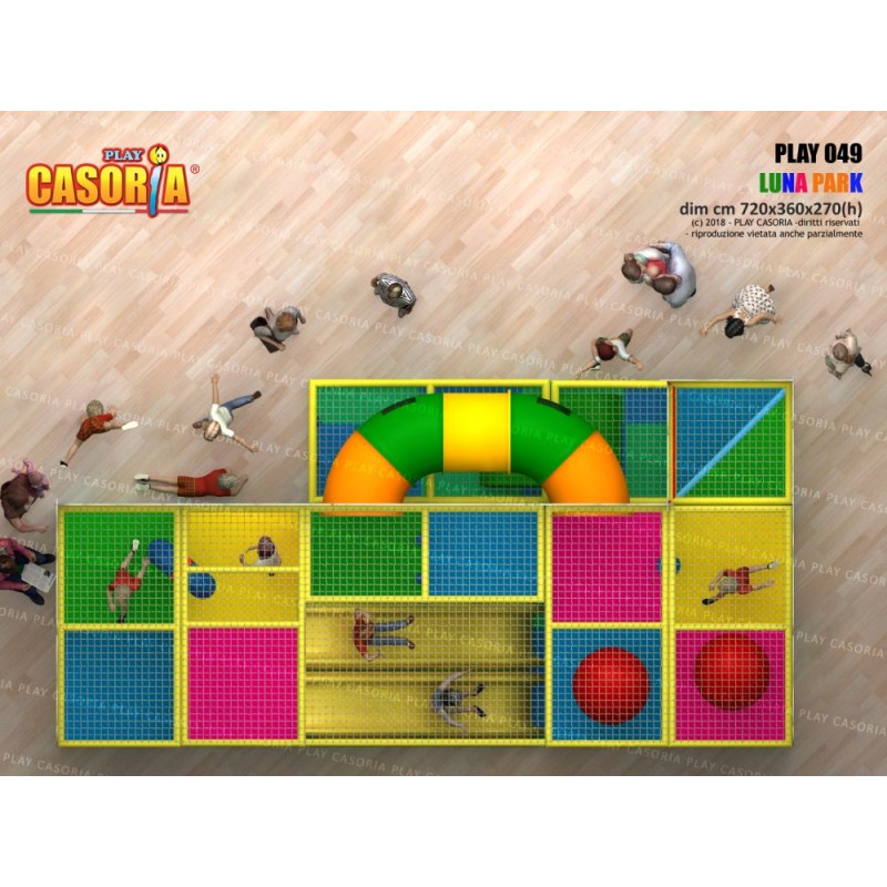 Playground modulare a due piani con scivolata nella vasca palline grazie agli scivoli interni. Arricchito da giochi come il ponte tibetano, passaggio a tubo e foresta di birilli, questa struttura è l'ideale per chi cerca un prodotto ad alte performance. Playground ideale per ludoteche, parchi gioco, centri commerciali, cinema, bar, ristoranti, pizzerie.