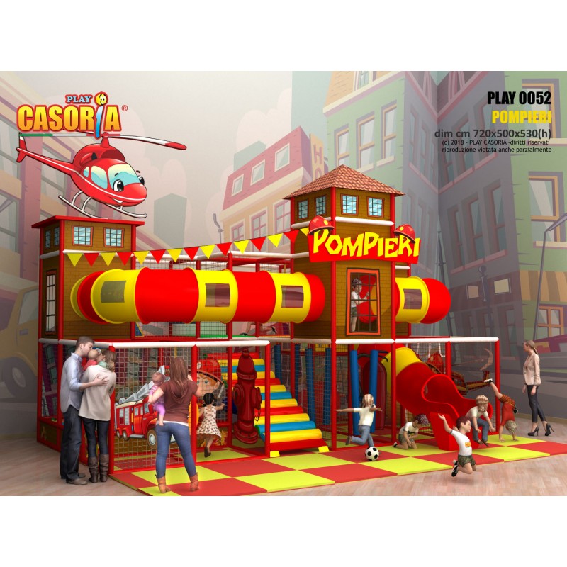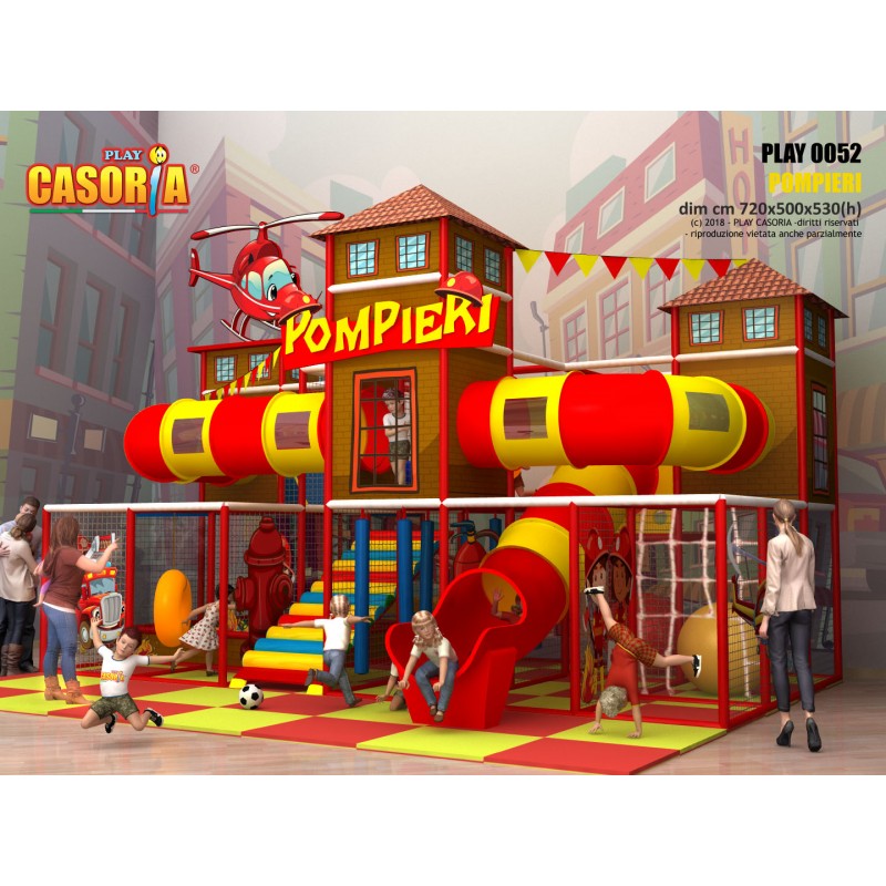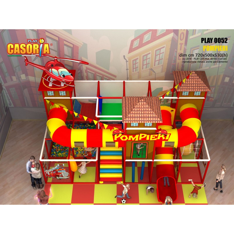 Playground modulare a due piani con il caratteristico scivolo a tubo esterno. Dotato di una grande risalita centrale perpendicolare ai passaggi a tubo, questo playground è uno dei più complessi della gamma. Arricchito da una vasca di palline, palloni giganti questa struttura è l'ideale per chi cerca un prodotto ad alte performance. Playground ideale per ludoteche, parchi gioco, centri commerciali, cinema, bar, ristoranti, pizzerie.