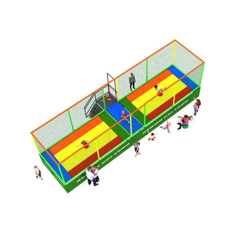 Trampolini "PRO" 2 tappeti con passerella centrale. I tappeti elastici professionali PLAY CASORIA sono sicuri e divertenti. Progettati e realizzati secondo le norme in materia, vengono fabbricati utilizzando solo materiali di prima qualità. Ideali per parchi gioco, centri commerciali, cinema, bar, ristoranti, pizzerie e spazi bimbi. DIVISORI ESCLUSI