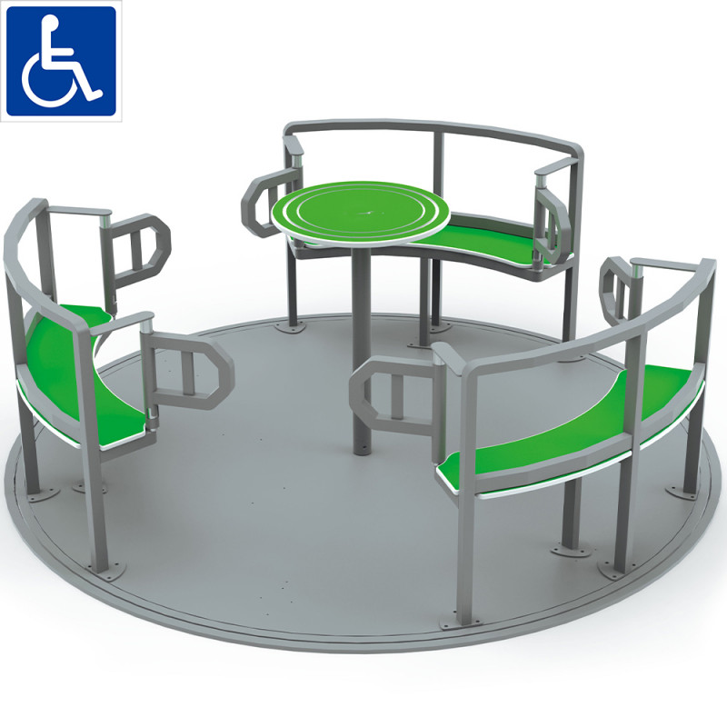 Giostra accessibile progettata per l’utilizzo simultaneo da parte di bambini normodotati e bambini in carrozzina. La struttura del gioco è costruita per garantire la massima robustezza.