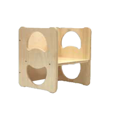 La sua costruzione permette di variare le altezze di seduta secondo le necessità del bambino, utilizzarla come tavolino oppure sgabello. Realizzata in legno multistrato di betulla lucidato al naturale.