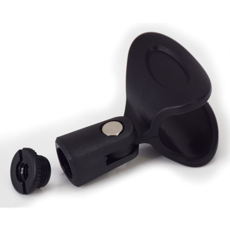 Supporto microfonico costruito con materia plastico leggero. Permette di sostenere qualsiasi microfono . Si avvita comodamente tramite ghiera filettata.