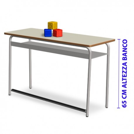 Struttura portante in tubolare in due elementi curvati da mm. 28 x 1,5, collegati fra loro con traverse in tubo da mm. 25 x 1,5 che sorreggono il sottopiano. Saldature a filo continuo mm 1,0. Verniciatura eseguita, previa preparazione del sottofondo mediante degrassaggio e fosfatazione, con polveri epossidiche polimerizzate in galleria termica a 220 gradi per uno spessore di 60 micron. Piano di scrittura in pannello truciolare fibrolegnoso (melaminico) E1 da mm. 18 con rivestimento sulle 2 facce. All'estremità puntali in plastica inestraibili. Sottopiano in lamiera da 6/10 o in plastica rigida. Pedana poggiapiedi in tubolare da mm. 28 x 1,5 saldata.