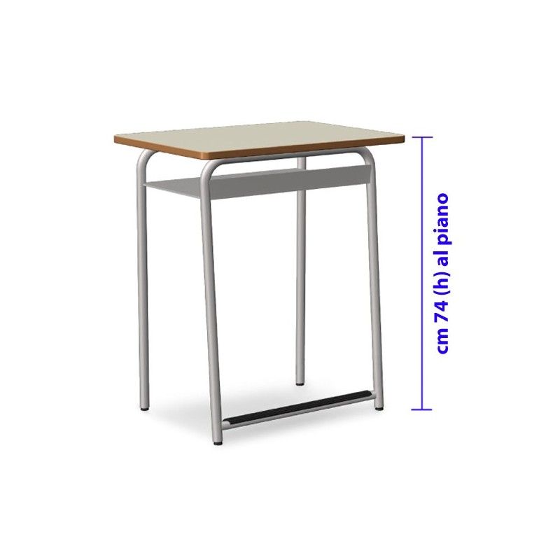 Struttura portante in tubolare in due elementi curvati da mm. 28x1,5, collegati fra loro con traverse in tubo da mm. 25x1,5 che sorreggono il sottopiano. Saldature a filo continuo mm 1,0. Verniciatura eseguita, previa preparazione del sottofondo mediante degrassaggio e fosfatazione, con polveri epossidiche polimerizzate in galleria termica a 220 gradi per uno spessore di 60 micron. RAL 7035. Piano di scrittura pannello truciolare fibrolegnoso (melaminico) E1 da mm. 18 con rivestimento sulle 2 facce, colore Magnolia con spigoli arrotondati. Sottopiano in lamiera da 6/10 o in plastica rigida. All'estremita' puntali in plastica inestraibili. Pedana poggiapiedi in tubolare da mm. 28x1,5 saldata a 2 gambe del banco e rivestita con profilo plastico rigato. DIM: CM 70 X 50 X 74 (h)