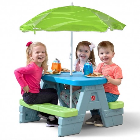 Tavolo da Picnic per bambini con ombrello, doppia seduta a panca. Struttura in plastica robusta, atossica e con angoli smussati. Perfetta per la spiaggia ed il giardino, ottima per lo sviluppo ed il role-play per i bimbi.