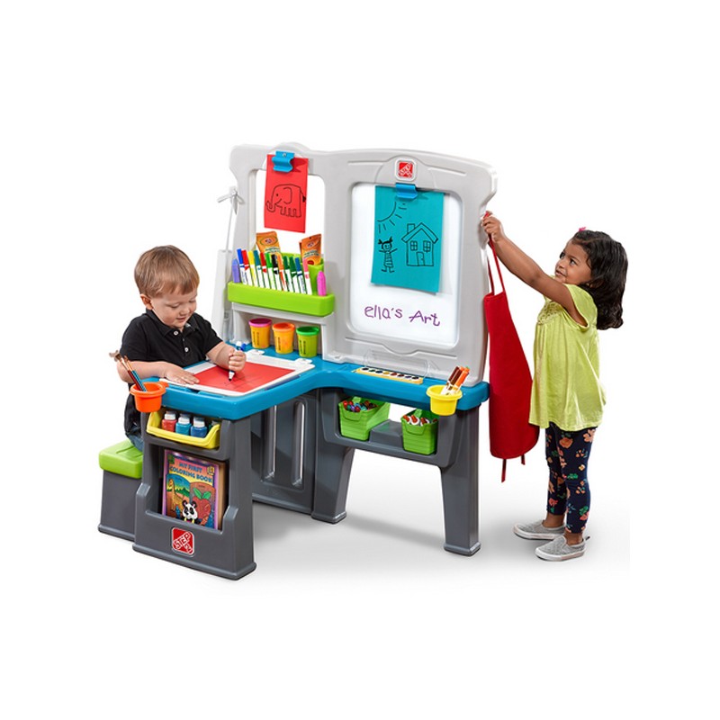 Banco Centro Creativo per bambini che potranno divertirsi a sedersi alla scrivania d'arte per disegnare e utilizzare la lavagna per disegnare e colorare. Per gli artisti che preferiscono stare in piedi mentre lavorano, possono utilizzare il retro della lavagna per scatenare la loro creatività. Particolarmente utili sono gli spazi extra dedicati per riporvi tutti gli oggetti utili alla creatività come pennarelli, fogli, libri, colori, matite.
