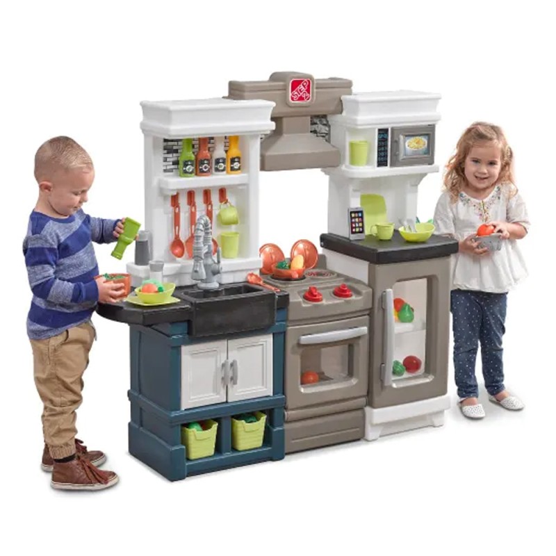 Questa cucina giocattolo farà sì che i mini chef siano entusiasti di imparare a cucinare! Questa cucina per bambini di qualità superiore presenta finiture degli elettrodomestici in stile ardesia che contribuiscono a integrare questo set da gioco nell'arredamento della casa di oggi. I piccoli chef possono tenere d'occhio il loro piatto mentre cercano l'ingrediente successivo grazie al frigorifero e al forno con vetro trasparente. Dopo aver mangiato il loro piatto preferito, i piccoli possono lavare i piatti nel lavello sovradimensionato in stile casalingo. Quando i piatti sono pronti e la ricreazione è finita, si può pulire rapidamente riponendo tutti gli accessori da cucina negli armadietti del piano inferiore.