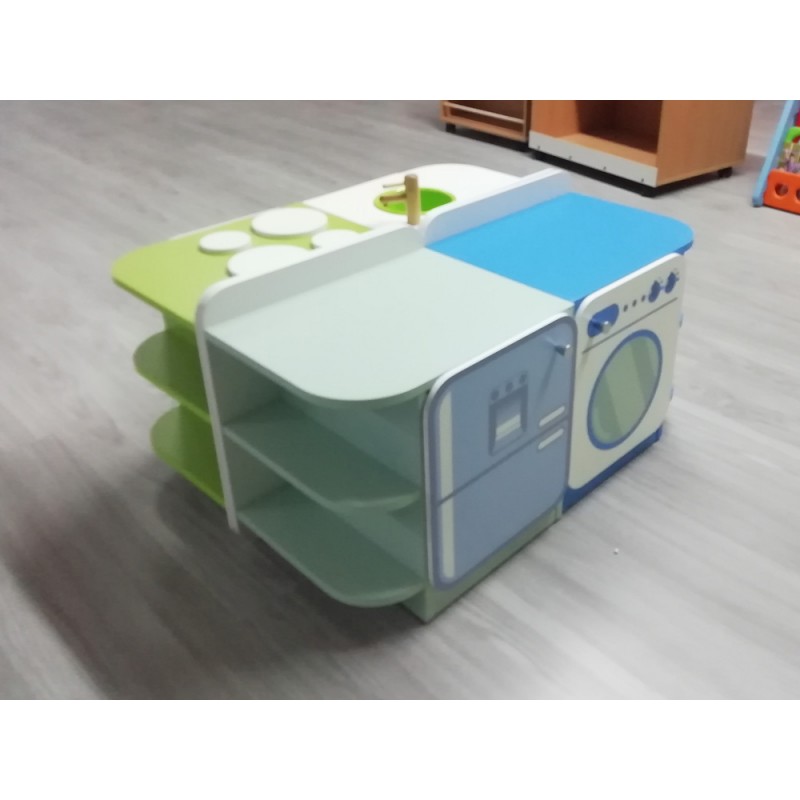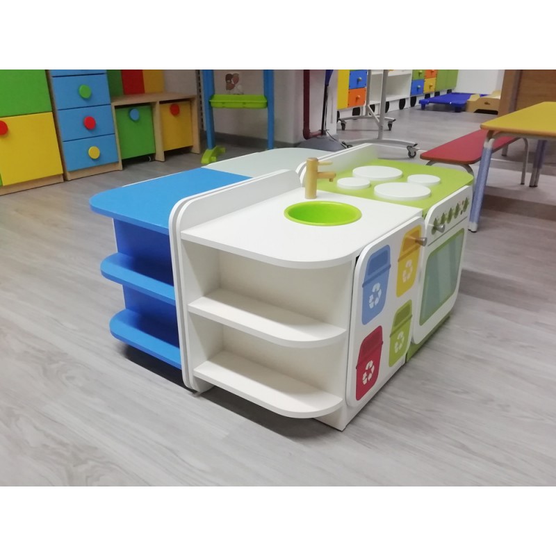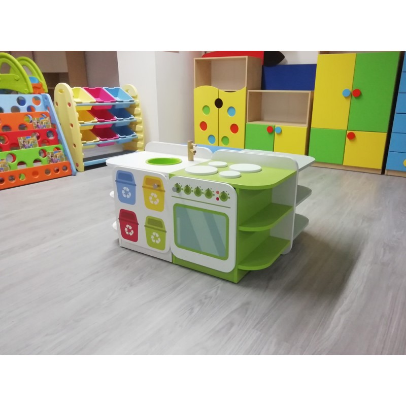 Mobile composizione cucina composto da piano cottura e frigo. I bambini si divertiranno a immaginare di interpretare un gioco di ruolo ed emulazione dell'adulto. Imparano il concetto di autonomia e l'importanza del gioco nella vita quotidiana. Si tratta di un mobile funzionale che diversifica lo spazio per il divertimento e l'apprendimento. Ha otto scaffali capienti che forniscono lo spazio per gli accessori e quattro armadi chiudibili a chiave. Grazie alla costruzione ben studiata, l'isola può svolgere varie funzioni, supportando il gioco creativo.