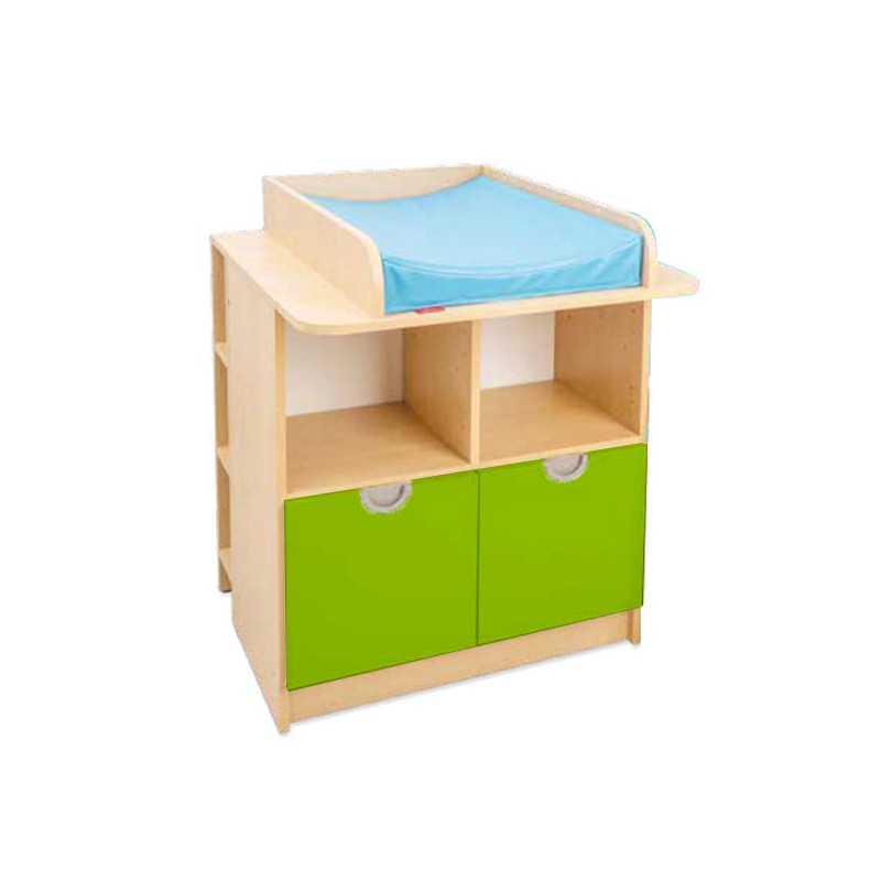 Il fasciatoio con materassino è una soluzione funzionale e confortevole, ideale per asili nido, scuole materne e altre strutture assistenziali. Dotato di 4 spaziose nicchie, consente un facile accesso agli accessori necessari. Il mobile è montato su un piano in truciolare da 18 mm di spessore, color betulla, che garantisce stabilità e durata nel tempo. Cassetti, materasso, gradini e un letto supplementare sono disponibili separatamente, consentendo di adattare il fasciatoio alle esigenze individuali dell'utente.