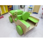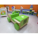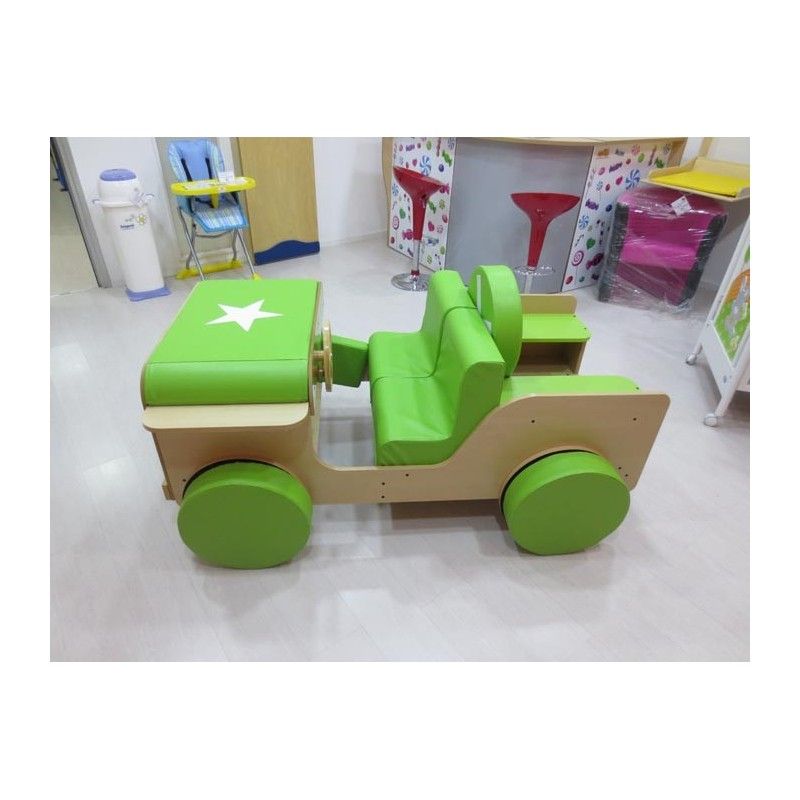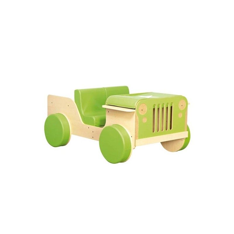 Jeep in legno con vani portaoggetti per riporvi giocattoli, costruzioni, accessori,  libri e tanto altro. Bellissimo articolo con cuscini morbidi e varie sedute per consentire ai bambini di giocare e fingere di guidare una vera Jeep. Dotata di elementi mobili: ruote morbide colorate e fari fissati con velcro, volante e leva del cambio mobili, bagagliaio, sedile rimovibile. Ideale come angolo lettura per bimbi.