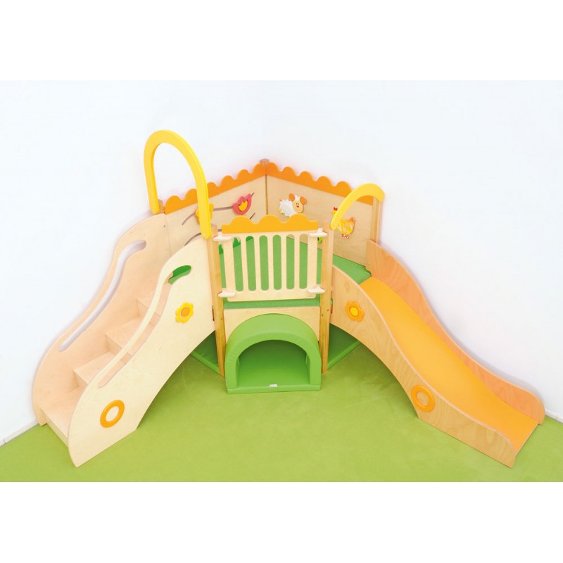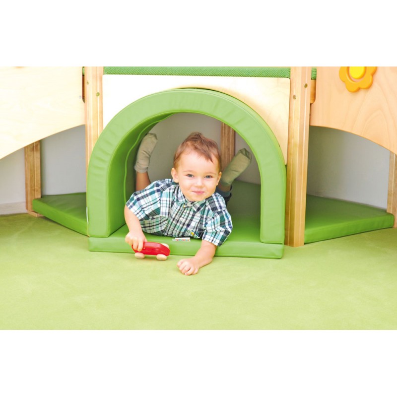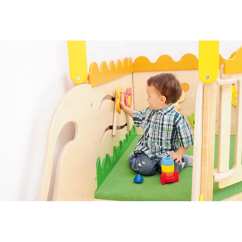 L'angolo giochi è dotato di morbidi materassi che offrono ai bambini un luogo sicuro per giocare. Ci sono scale da un lato e uno scivolo dall'altro. All'interno ci sono molte attrazioni sotto forma di elementi sensoriali.
