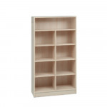 Armadio a giorno con struttura in legno nobilitato chiaro, completo di divisorio centrale, 8 ripiani capienti e pratico sopralzo superiore. Ideale per ambienti scolastici, ludoteche e aule didattiche, consente una suddivisione ordinata di materiali, libri e oggetti. Il sopralzo aumenta la capacità contenitiva, ottimizzando lo spazio in altezza.