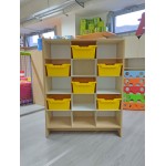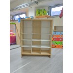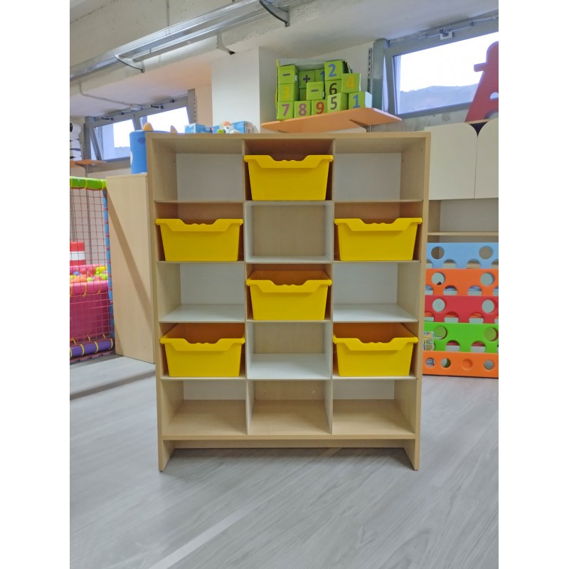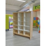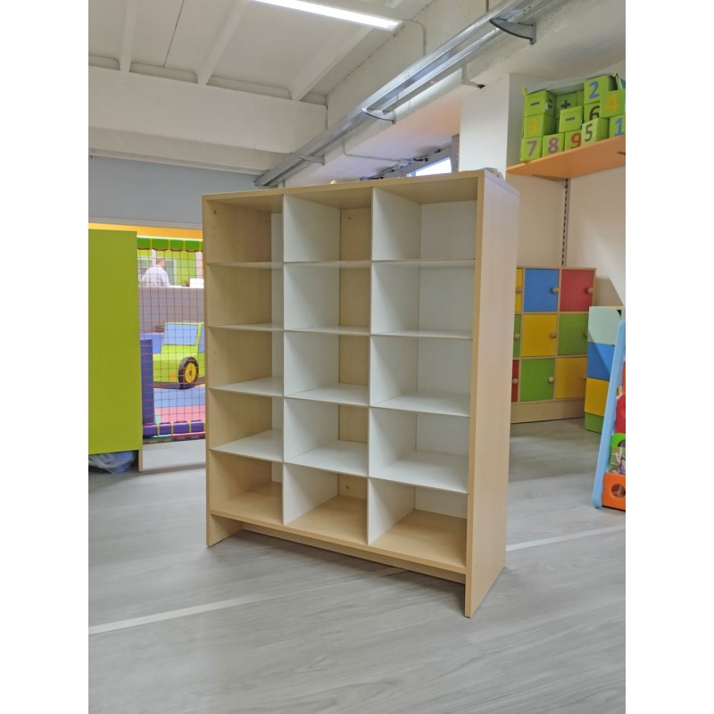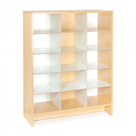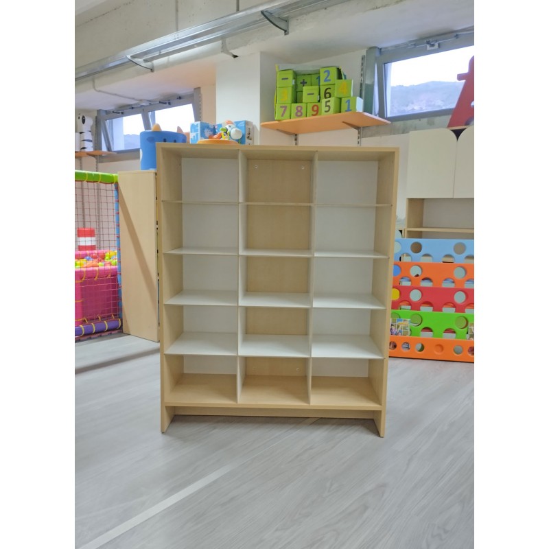 La struttura è realizzata in truciolare color betulla da 18 mm di spessore. All'interno ci sono 9 ripiani realizzati in pannello MDF da 31 x 36,5 cm, spessore 6 mm di colore bianco.