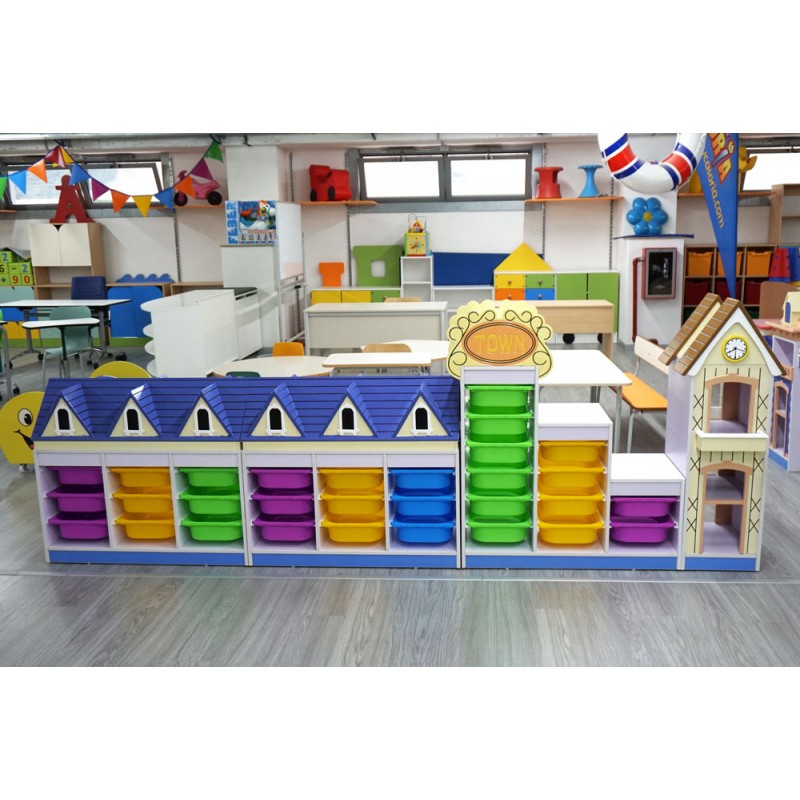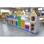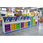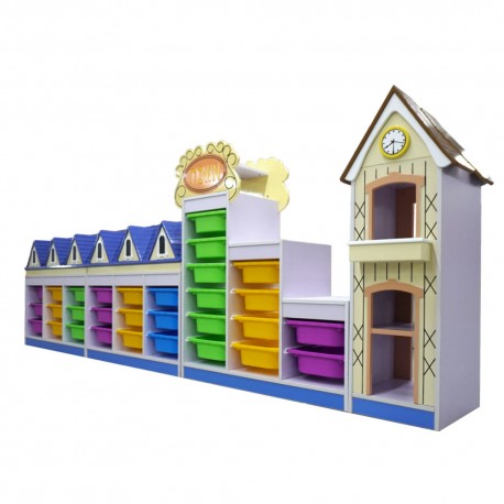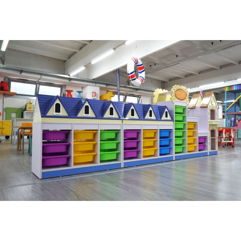 Mobile composizione 2 composto da armadi funzionali e pratici, una moltitudine di cassetti e mensole esterne che aiutano la sistemazione di materiali didattici o giocattoli. Bellissima composizione colorata con cassetti a scorrimento di facile apertura e chiusura. Ideale per scuole, ludoteche e nidi.