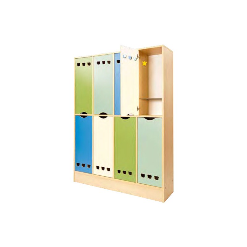 Armadio guardaroba Pastello. Il telaio è realizzato in truciolato laminato color betulla. Il modulo ha otto sezioni rettangolari, ciascuno dei quali ha un appendino in metallo e una mensola. I colori delle porte sono: bianco, blu, verde azzurro e con applicazioni traforate a forma di orsacchiotti e farfalle che consentono la circolazione dell'aria.