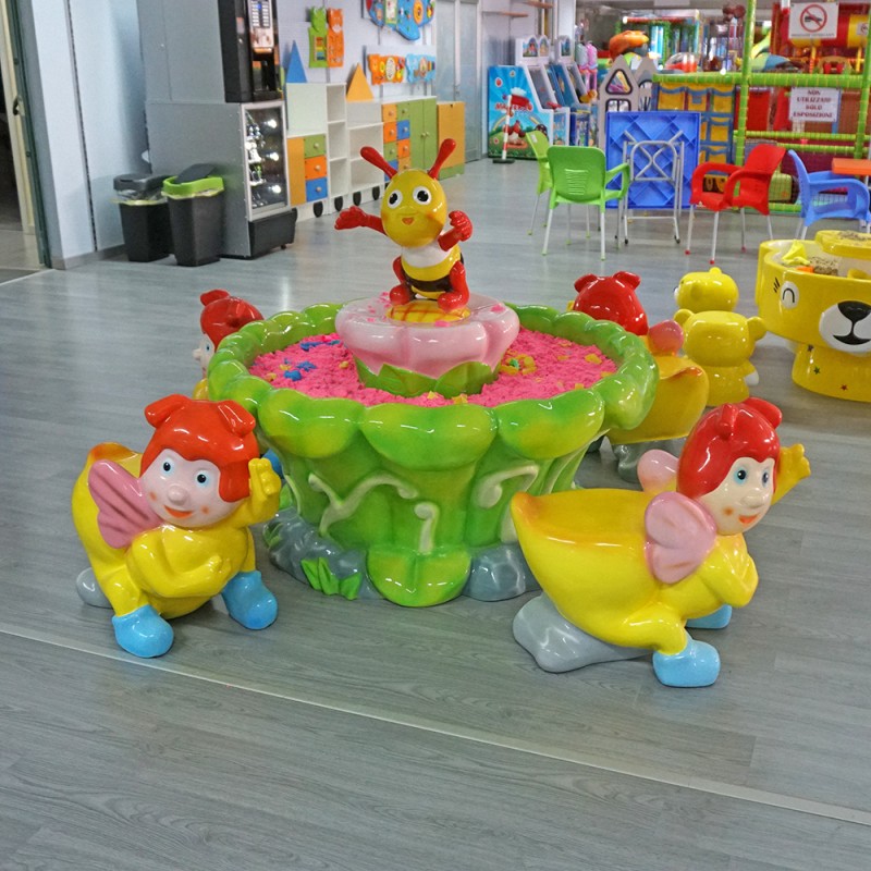 Tavolo sabbiera Ape con sedute. Questo bellissimo tavolo in resina è composto da una vasca che può contenere sabbia cinetica o acqua. La sabbia cinetica consente di giocare e creare forme come si farebbe in spiaggia però restando puliti e seduti comodamente vicino al tavolo. Ideale per ludoteche, scuole, nidi, ecc.. Dim: CM. 130 X 130 X135 (H)