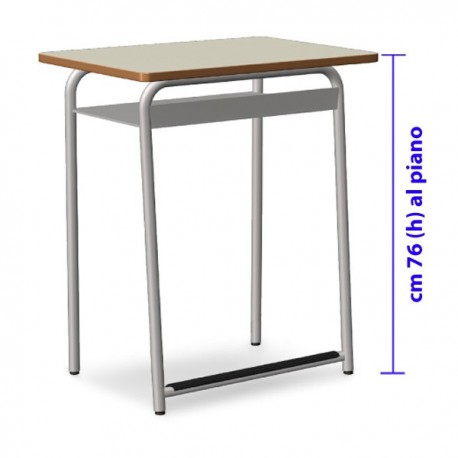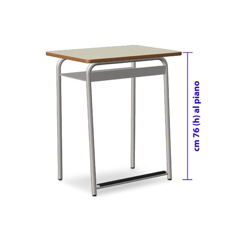 • Struttura portante in tubolare in due elementi curvati da mm. 28x1,5, collegati fra loro con traverse in tubo da mm. 25x1,5 che sorreggono il sottopiano. Saldature a filo continuo mm 1,0. Verniciatura eseguita, previa preparazione del sottofondo mediante degrassaggio e fosfatazione, con polveri epossidiche polimerizzate in galleria termica a 220 gradi per uno spessore di 60 micron. RAL 7035. Piano di scrittura pannello truciolare fibrolegnoso (melaminico) E1 da mm. 18 con rivestimento sulle 2 facce, colore Magnolia con spigoli arrotondati. Sottopiano in lamiera da 6/10 o in plastica rigida. All'estremita' puntali in plastica inestraibili. Pedana poggiapiedi in tubolare da mm. 28x1,5 saldata a 2 gambe del banco e rivestita con profilo plastico rigato. DIM: CM 70 X 50 X 76 (h)